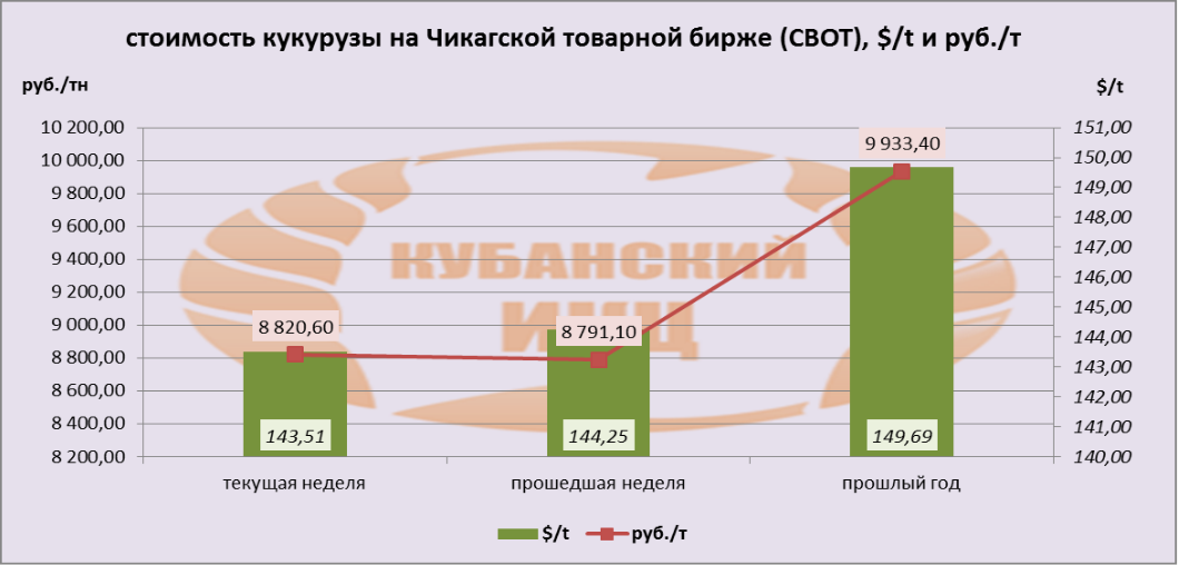 На момент написания статьи, цена кукурузы на мировых рынках (CBOT) была озвучена как 143,51 $/т или 8820,6 руб./т. По сравнению с данными прошлой недели, мы прослеживаем понижение цен в валюте но не в рублях.