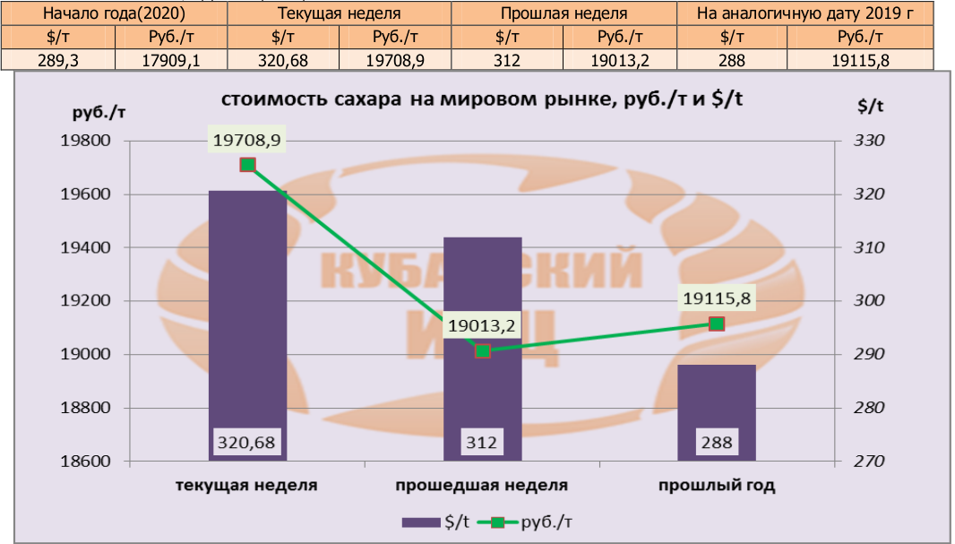 Цены на сахар-сырец (США No11) на момент подготовки соответственно 19708,9 руб./т при пересчёте.