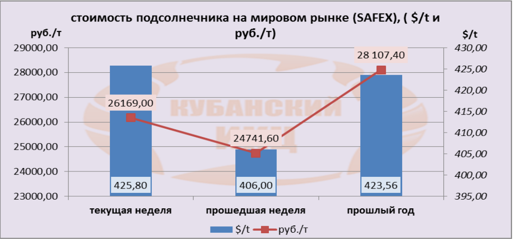 Цена подсолнечника на бирже SAFEX (поставка в январе) на момент написания обзора была озвучена в значениях 425,8 $/т или 26169,9 руб./т.