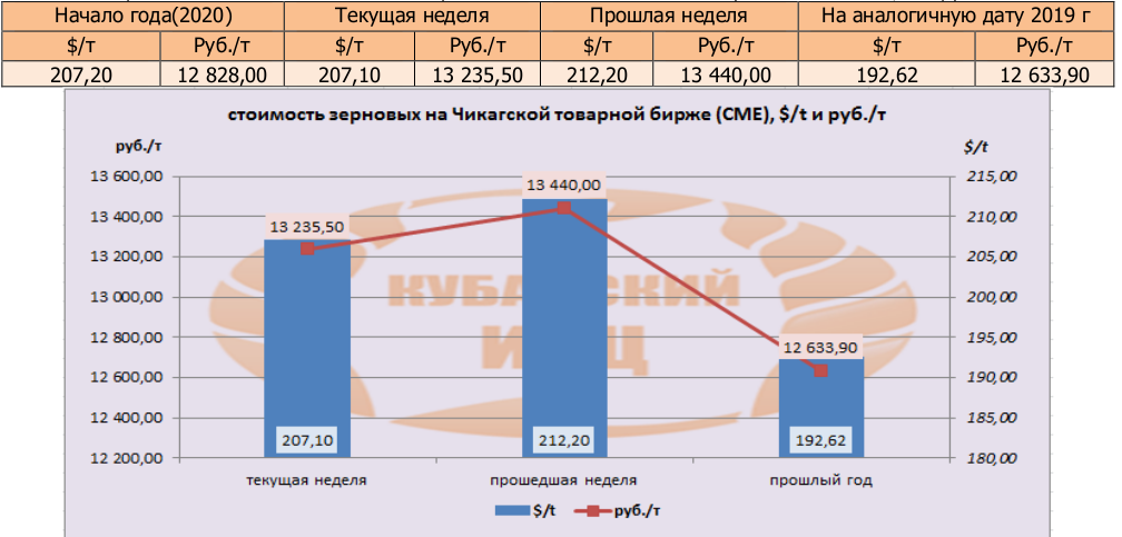 На момент написания статьи, на Чикагской товарной бирже (СВОТ) предлагают $207,10 за тонну пшеницы, или 13235,50 руб./т в перерасчёте на рубли, что меньше в валюте, и в рублевом эквиваленте по сравнению с прошлой неделей. По сравнению с аналогичной датой прошлого года цены на пшеницу выше в валюте, и в рублях.