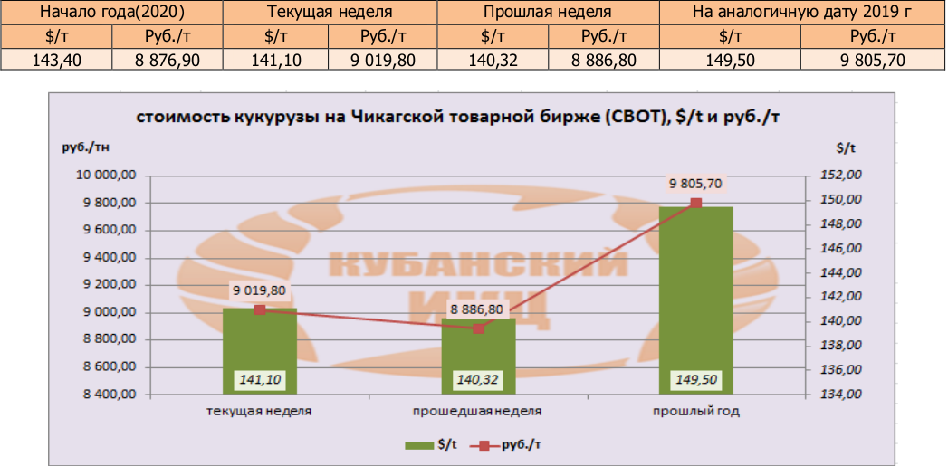 На момент написания статьи, цена кукурузы на мировых рынках (CBOT) была озвучена как 141,1 $/т или 9019,8 руб./т. По сравнению с данными прошлой недели, мы прослеживаем повышение цен в валюте и в рублях.