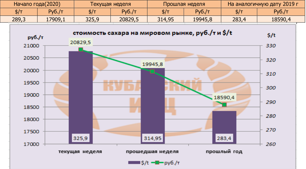 Цены на сахар-сырец (США No11) на момент подготовки материала зафиксированы на уровне 325,9 $/т, и соответственно 20825,5 руб./т при пересчёте.