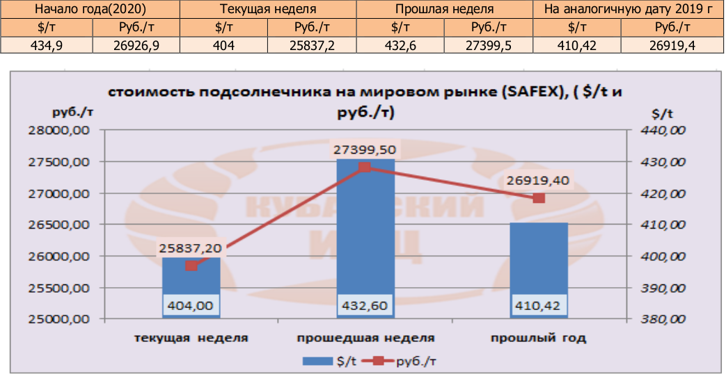Цена подсолнечника на бирже SAFEX (поставка в феврале) на момент написания обзора была озвучена в значениях 404 $/т или 25837,2 руб./т.