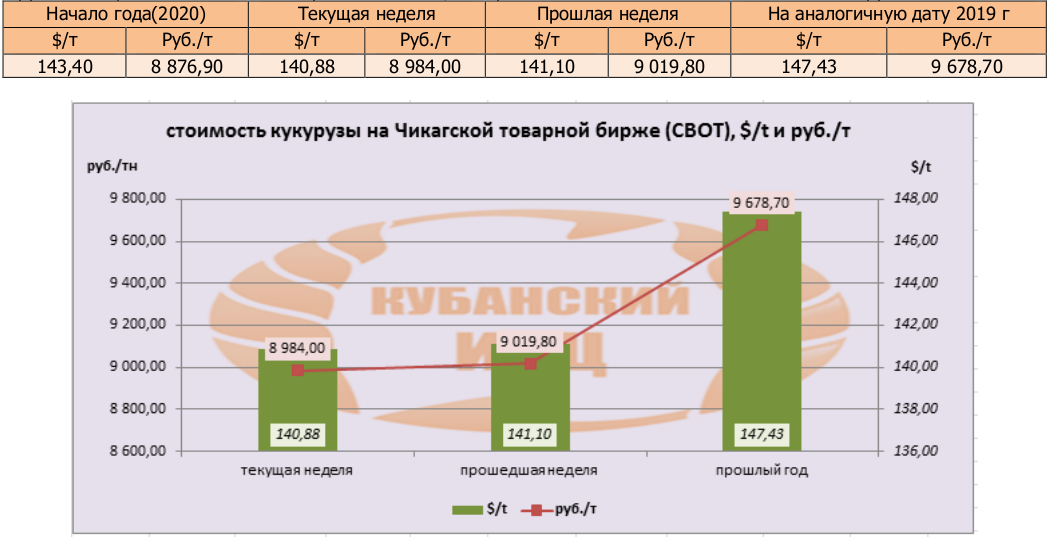 На момент написания статьи, цена кукурузы на мировых рынках (CBOT) была озвучена как 140,88 $/т или 8984,0 руб./т. По сравнению с данными прошлой недели, мы прослеживаем понижение цен в валюте и в рублях.