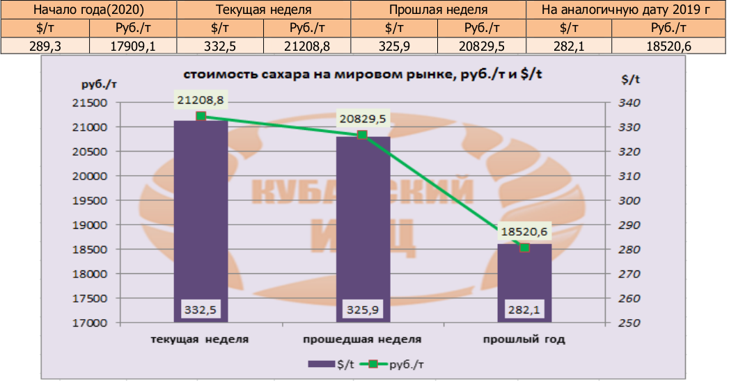 Цены на сахар-сырец (США No11) на момент подготовки материала зафиксированы на уровне 332,5 $/т, и соответственно 21208,8 руб./т при пересчёте.