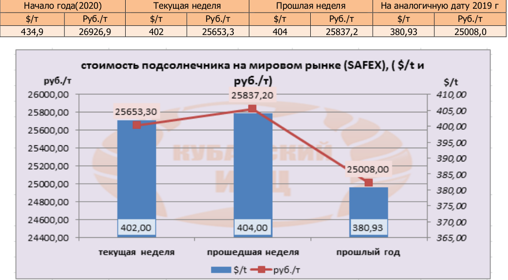 Цена подсолнечника на бирже SAFEX (поставка в феврале) на момент написания обзора была озвучена в значениях 402 $/т или 25653,3 руб./т.