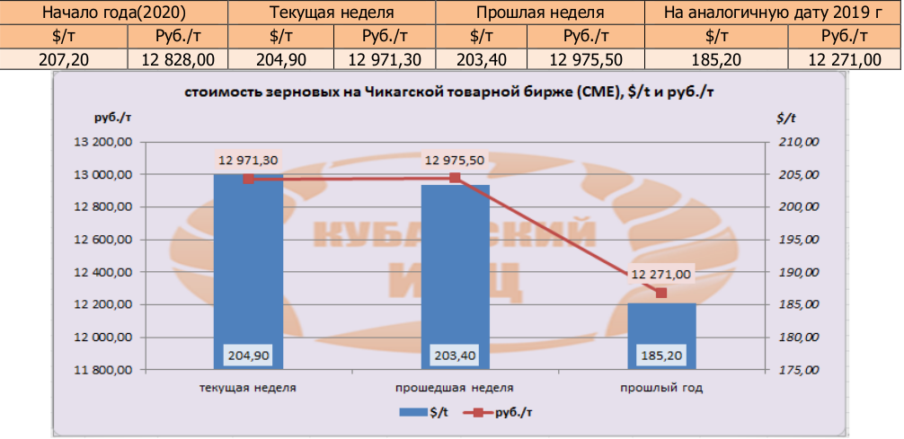 На момент написания статьи, на Чикагской товарной бирже (СВОТ) предлагают $204,90 за тонну пшеницы, или 12971,30 руб./т в перерасчёте на рубли, что больше в валюте, но не в рублевом эквиваленте по сравнению с прошлой неделей. По сравнению с аналогичной датой прошлого года цены на пшеницу выше в валюте, и в рублях.