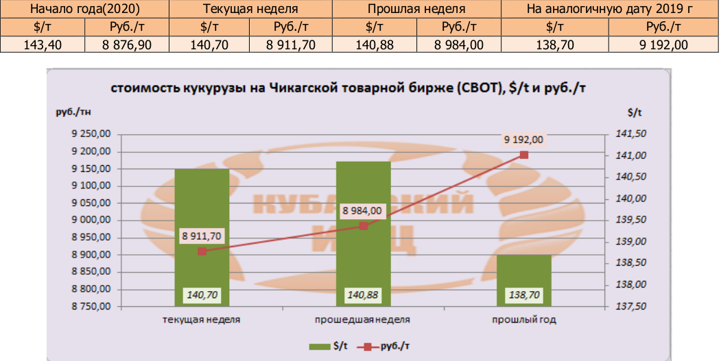 На момент написания статьи, цена кукурузы на мировых рынках (CBOT) была озвучена как 140,88 $/т или 8984,0 руб./т. По сравнению с данными прошлой недели, мы прослеживаем понижение цен в валюте и в рублях.
