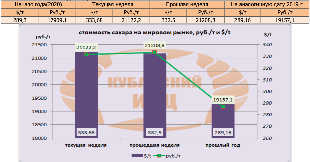 Цены на сахар-сырец (США No11) на момент подготовки материала зафиксированы на уровне 333,68 $/т, и соответственно 21122,2 руб./т при пересчёте.