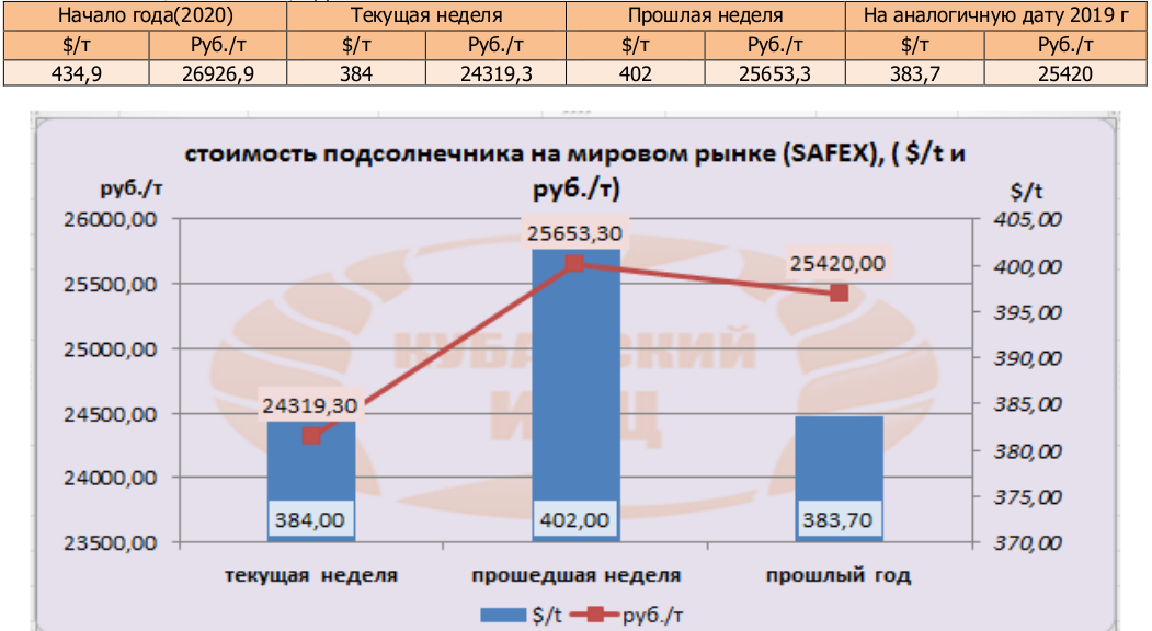 Цена подсолнечника на бирже SAFEX (поставка в феврале) на момент написания обзора была озвучена в значениях 384 $/т или 24319,3 руб./т.