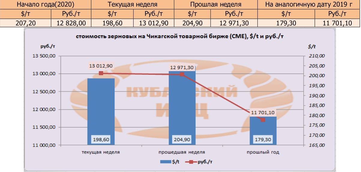 На момент написания статьи, на Чикагской товарной бирже (СВОТ) предлагают $198,6 за тонну пшеницы, или 13012,9 руб./т в перерасчёте на рубли, что меньше в валюте, но не в рублевом эквиваленте по сравнению с прошлой неделей. По сравнению с аналогичной датой прошлого года цены на пшеницу выше в валюте, и в рублях.