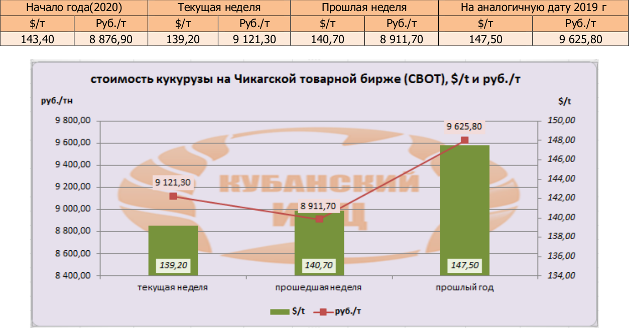 На момент написания статьи, цена кукурузы на мировых рынках (CBOT) была озвучена как 139,2 $/т или 9121,3 руб./т. По сравнению с данными прошлой недели, мы прослеживаем понижение цен в валюте, но не в рублях.
