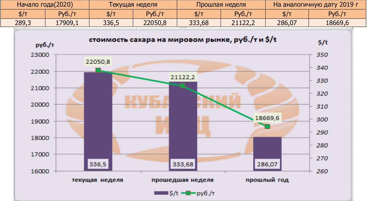 Цены на сахар-сырец (США No11) на момент подготовки материала зафиксированы на уровне 336,5 $/т, и соответственно 22050,8 руб./т при пересчёте.