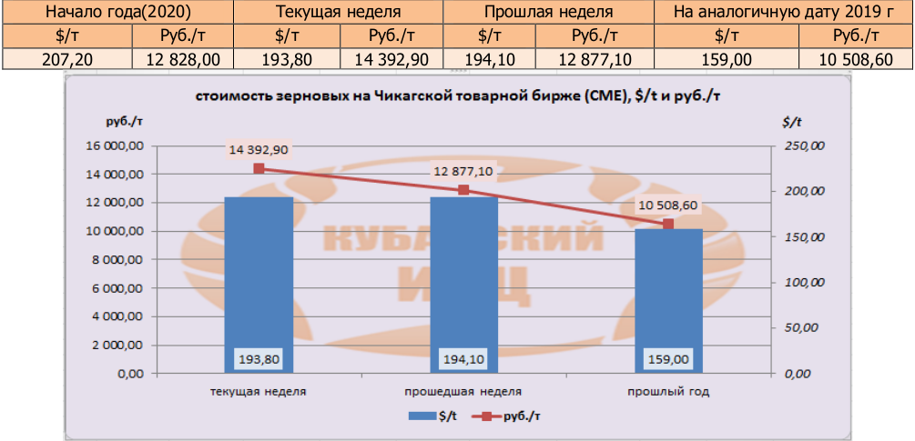 На момент написания статьи, на Чикагской товарной бирже (СВОТ) предлагают $193,8 за тонну пшеницы, или 14392,9 руб./т в перерасчёте на рубли, что меньше в валюте, но не в рублевом эквиваленте по сравнению с прошлой неделей. По сравнению с аналогичной датой прошлого года цены на пшеницу выше в валюте, и в рублях.