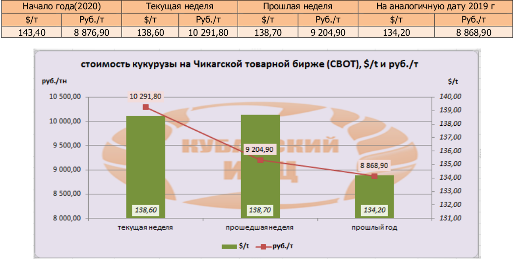 На момент написания статьи, цена кукурузы на мировых рынках (CBOT) была озвучена как 138,6 $/т или 10291,8 руб./т. По сравнению с данными прошлой недели, мы прослеживаем понижение цен в валюте, но не в рублях.
