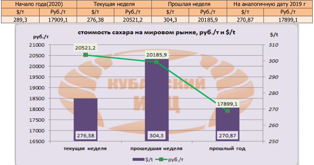 Цены на сахар-сырец (США No11) на момент подготовки материала зафиксированы на уровне 276,38 $/т, и соответственно 20521,2 руб./т при пересчёте.