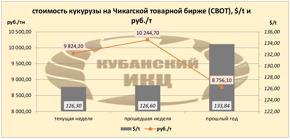 На момент написания статьи, цена кукурузы на мировых рынках (CBOT) была озвучена как 126,3 $/т или 9824,2 руб./т. По сравнению с данными прошлой недели, мы прослеживаем мизерное понижение цен в валюте, и вполне ощутимое в рублях.