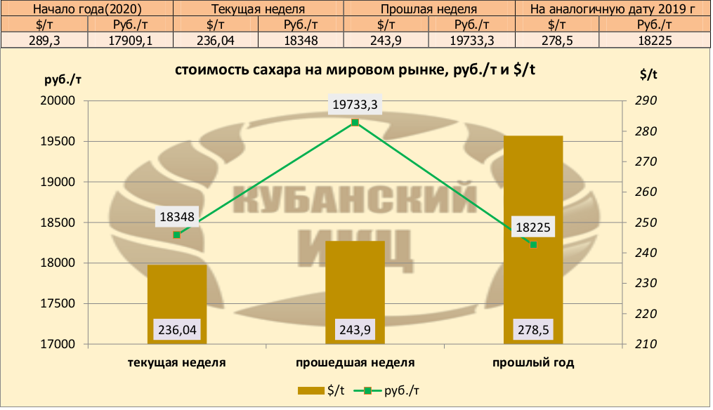 Цены на сахар-сырец (США No11) на момент подготовки материала зафиксированы на уровне 236,04 $/т, и соответственно 18348 руб./т при пересчёте.