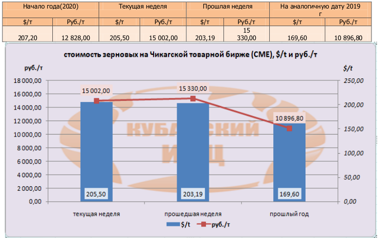 На момент написания статьи, на Чикагской товарной бирже (СВОТ) предлагают $205,50 за тонну пшеницы, или 15002 руб./т в перерасчёте на рубли, что больше в валюте, но не в рублевом эквиваленте по сравнению с прошлой неделей. По сравнению с аналогичной датой прошлого года цены на пшеницу выше в валюте, и в рублях.