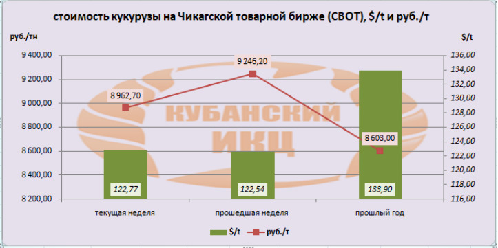 На момент написания статьи, цена кукурузы на мировых рынках (CBOT) была озвучена как 122,77 $/т или 8962,7 руб./т. По сравнению с данными прошлой недели, мы прослеживаем незначительное повышение понижение цен в валюте, и понижение в рублях.