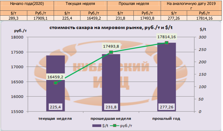 Цены на сахар-сырец (США No11) на момент подготовки материала зафиксированы на уровне 225,4 $/т, и соответственно 16459,2 руб./т при пересчёте.