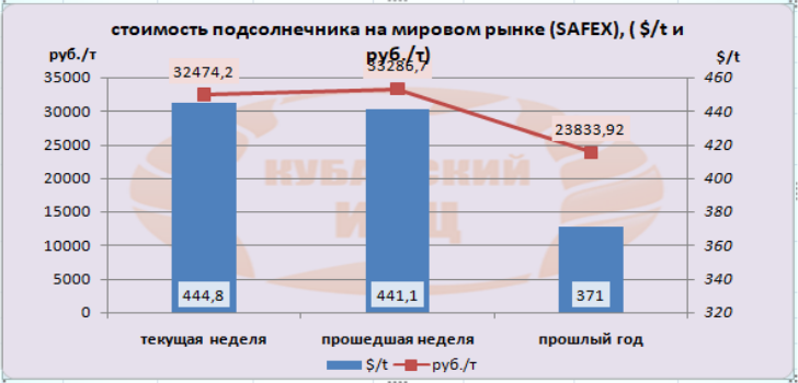 Цена подсолнечника на бирже SAFEX (поставка в мае) на момент написания обзора была озвучена в значениях 444,8 $/т или 33286,7руб./т.