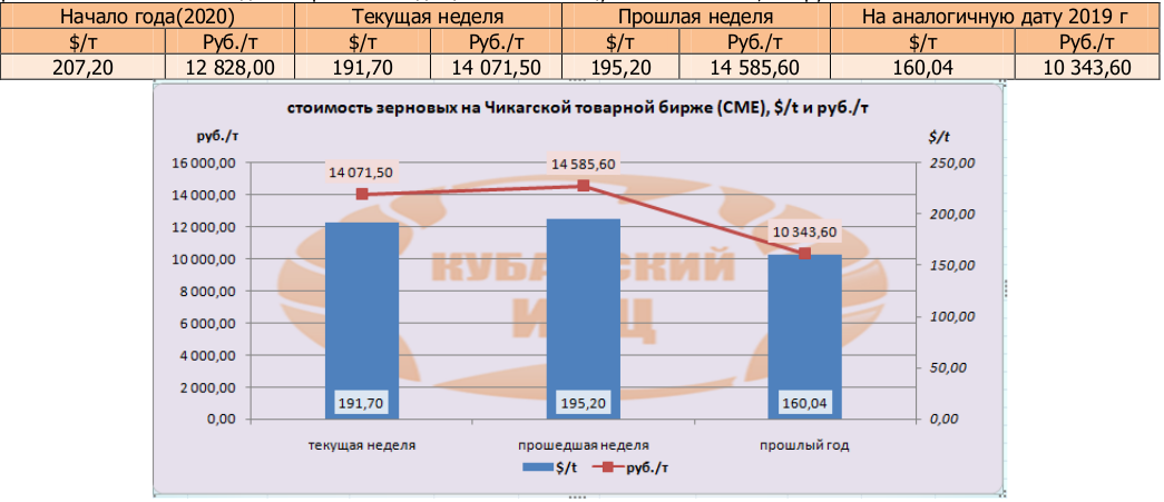 На момент написания статьи, на Чикагской товарной бирже (СВОТ) предлагают $191,70 за тонну пшеницы, или 14071,5 руб./т в перерасчёте на рубли, что меньше в валюте, и в рублевом эквиваленте по сравнению с прошлой неделей. По сравнению с аналогичной датой прошлого года цены на пшеницу выше в валюте, и в рублях.