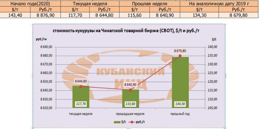 На момент написания статьи, цена кукурузы на мировых рынках (CBOT) была озвучена как 117,70 $/т или 8644,8 руб./т. По сравнению с данными прошлой недели, мы прослеживаем повышение цен в валюте, и в рублях.
