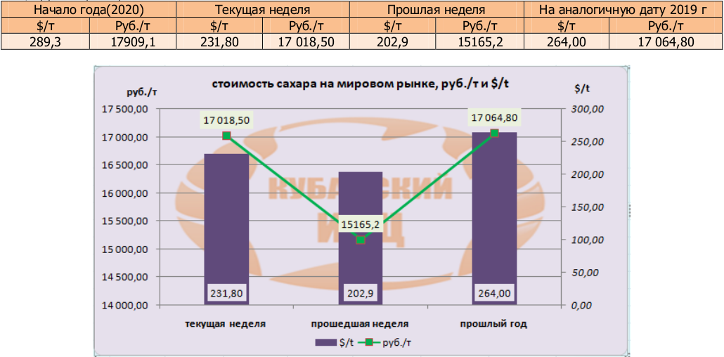Цены на сахар-сырец (США No11) на момент подготовки материала зафиксированы на уровне 231,8 $/т, и соответственно 17018,5 руб./т при пересчёте.