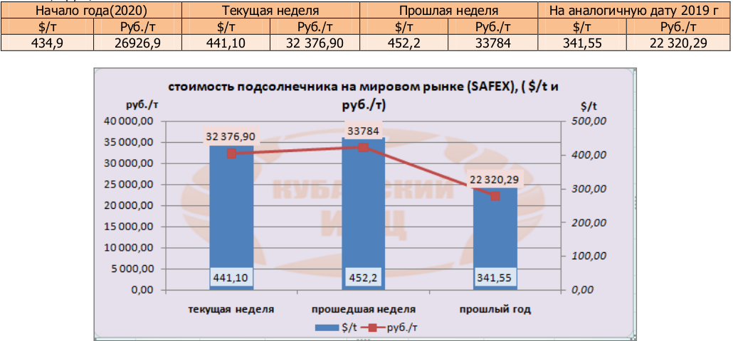 Цена подсолнечника на бирже SAFEX (поставка в мае)на момент написания обзора была озвучена в значениях 441,1 $/т или 32376,9 руб./т.