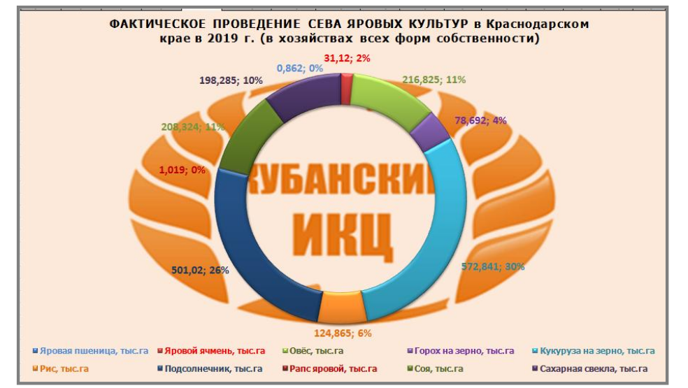 га; овса – 216,825 тыс. га; гороха на зерно – 78,692 тыс. га; кукурузы на зерно – 572,841 тыс. га; риса –