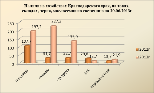 Поступление нового урожая зерновых 2013г. на элеваторах Краснодарского края по состоянию на 20.06.2013г.: