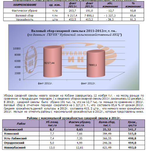 На сегодня перерабатывающие предприятия Краснодарского края произвели миллион тонн сахара-песка из сахарной свеклы урожая 2012 года, сообщили в краевом Минсельхозе. По-прежнему, лидерами остаются ЗАО «Успенский сахарник»; ОАО «Сахарный завод Ленинградский»; ОАО «Виктор». Фактически переработано - 8,7 миллиона тонн. Валовой сбор сахарной свеклы в Краснодарском крае в 2012 году составил 7,4 миллиона тонн. Из 16 шесть сахарных заводов края продолжают работу. С начала переработки сахарными заводами заготовлено 9,2 миллиона тонн сахарной свеклы. Фактически переработано - 8,7 миллиона тонн. Выработка сушеного жома составила 224 тысячи тонн.
