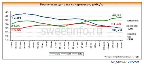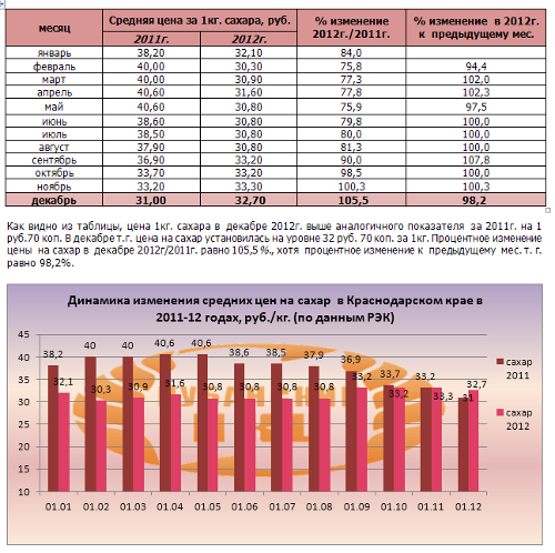 Средние цены на сахар по Краснодарскому краю 2011-2012гг. (по данным РЭК)