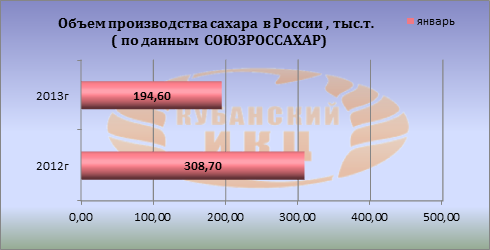 Из графика видно, что за январь 2013г. произведено сахара в РФ 194,60 тыс. т., что на 114,10 тыс. т меньше, по сравнению с январем 2012г. Объем производства сахара за январь 2013г. составил 63% от объема производства сахара за аналогичный период 2012г.