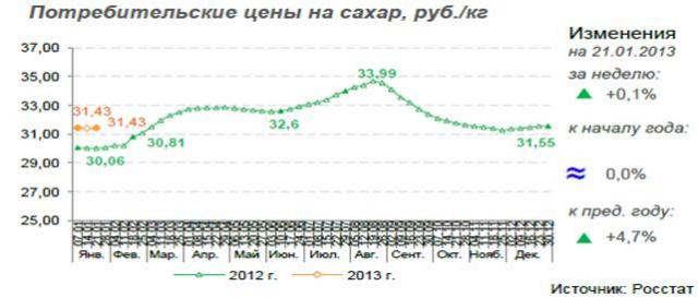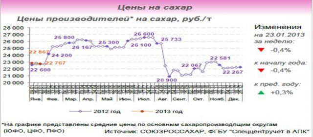 По данным Росстата и оценкам Союзроссахара, среднегодовая оптовая цена сахара в 2012 году была самой низкой за последние три года и составила 23,2 руб./кг. (с НДС), что на 15 процентов ниже аналогичного уровня цен 2011 года и на 11 процентов ниже цен 2010 года. Фактически сахар был одним из немногих продуктов-дефляторов в потребительской корзине, который замедлял инфляцию, и вместе с тем, оставался одним из самых доступных социально-значимых продуктов на столе россиян. Снижение оптовых цен произошло из-за действия внутренних факторов: высокие показатели самообеспеченности сахаром собственного производства, наличие значительных переходящих запасов, говорится в сообщении Союзроссахара.