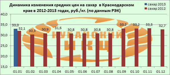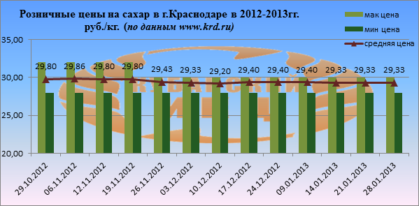 Средняя цена на сахар в Краснодарском крае в январе 2013г. составила 33 руб. 00коп., что выше аналогичного показателя 2012г. на 90 коп. Темп роста средней цены на сахар 2013г. по отношению к 2012г. – 102,8%.