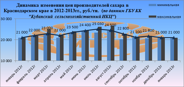 В декабре 2012г. и январе 2013г. средние цены производителей сахара в Краснодарском крае установились на уровне 21тыс. руб. за 1 тн.