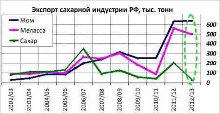 Экспорт сахарной индустрии РФ в 2012/13 г. (с 01 августа) по оценке ИКАР может составить: Сахар – не более 40 тыс. тонн, по сравнению с более чем 205 тыс. тонн в 2011/12 г. (без учёта авто-вывоза в Казахстан); Меласса – не более 500 тыс. тонн, по сравнению с более чем 560 тыс. тонн в 2011/12 г.; Гранулированный свекловичный жом – более 635 тыс. тонн, по сравнению с более чем 630 тыс. тонн в 2011/12 г.